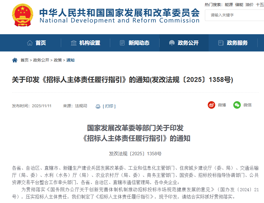 國(guó)家發(fā)展改革委等部門(mén)印發(fā)《招標(biāo)人主體責(zé)任履行指引》(發(fā)改法規(guī)〔2025〕1358號(hào))