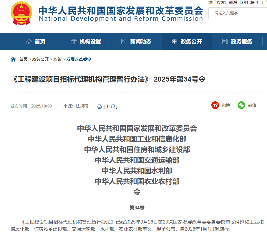 國(guó)家發(fā)展改革委公布《工程建設(shè)項(xiàng)目招標(biāo)代理機(jī)構(gòu)管理暫行辦法》2025年第34號(hào)令