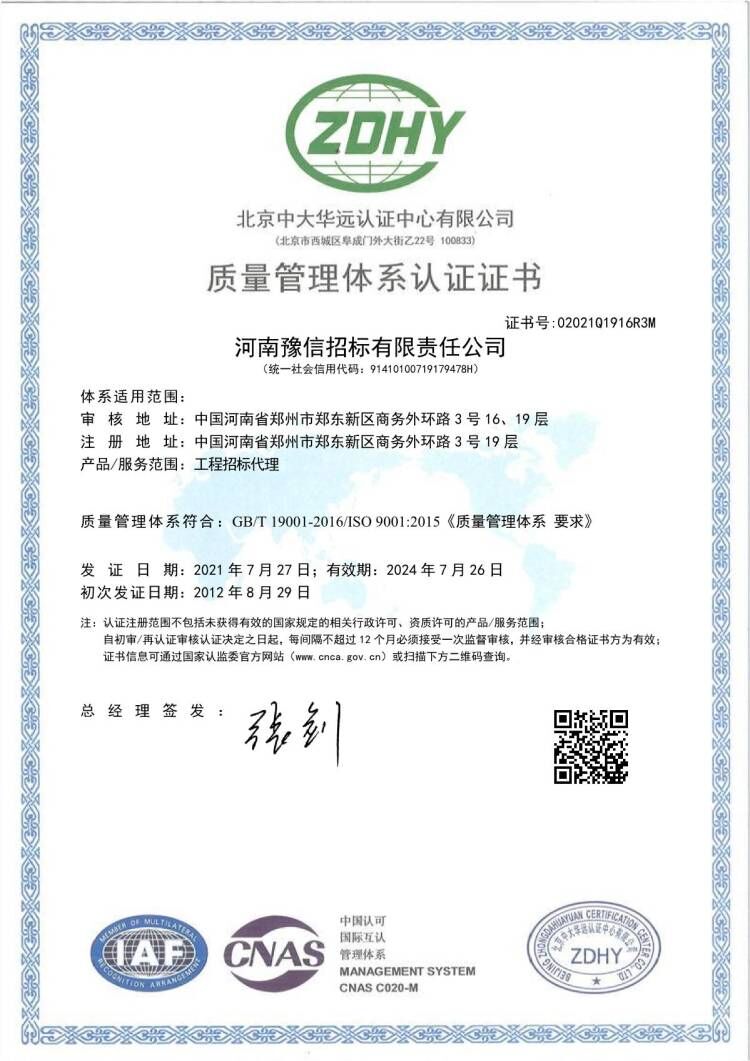 河南豫信招標(biāo)有限責(zé)任公司QMS質(zhì)量管理系體認(rèn)證證書中文 -
