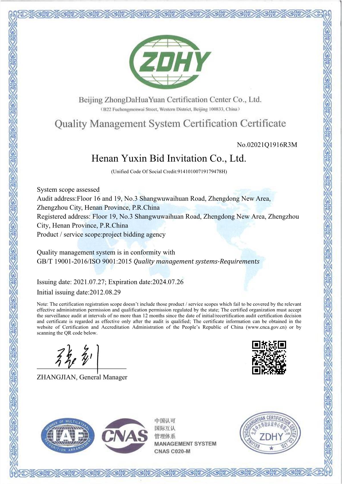 河南豫信招標(biāo)有限責(zé)任公司QMS質(zhì)量管理系體認(rèn)證證書英文