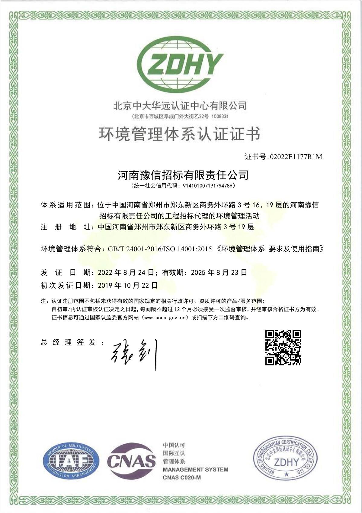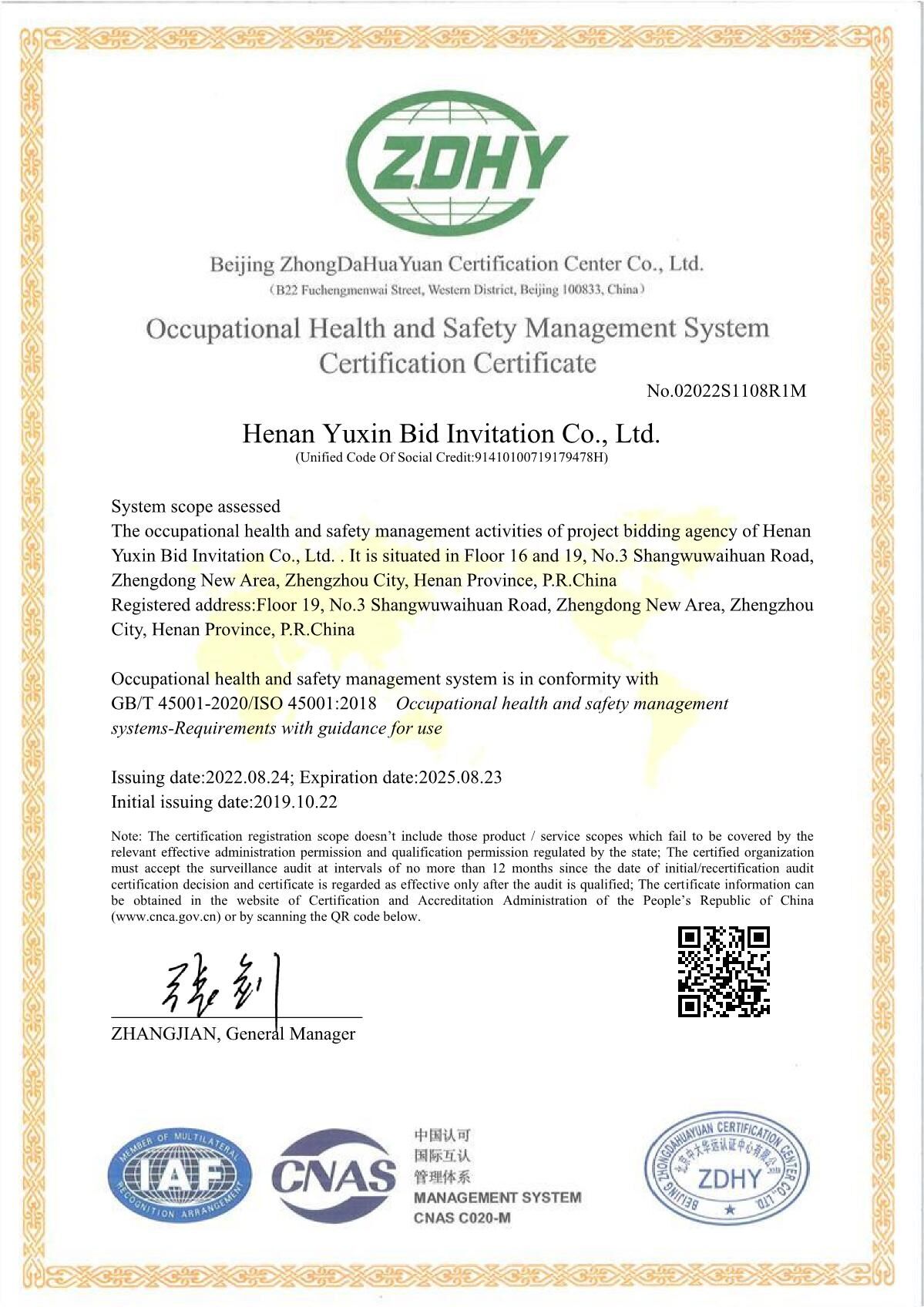 河南豫信招標(biāo)有限責(zé)任公司OHSMSSMS中文證書 -