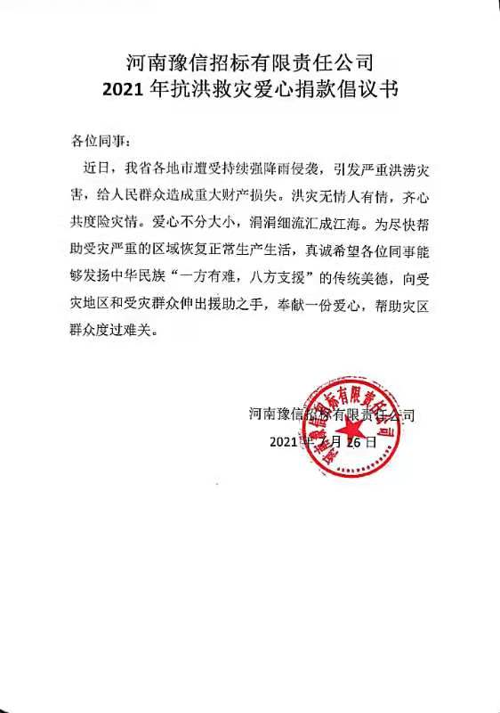 受超強降雨影響,目前河南省內(nèi)抗洪救災(zāi)仍在繼續(xù)!我省仍有多地汛情嚴峻,身為河南本土國有企業(yè),河南豫信招標有限責(zé)任公司 號召 公司干部職工 以實際行動幫助災(zāi)區(qū)人民抗洪救災(zāi)、重建家園 。