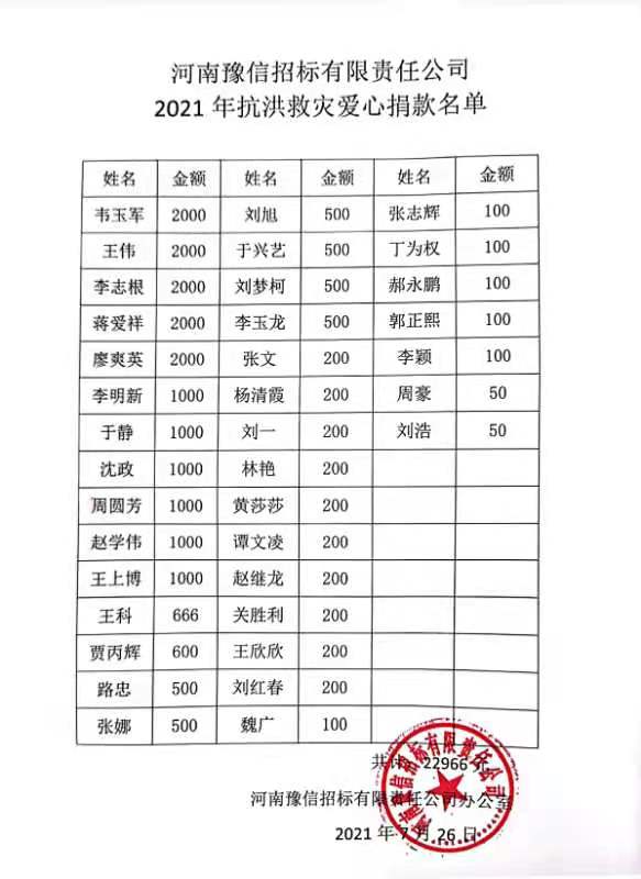 當前位置:首頁 > 公司風(fēng)采 > 河南豫信招標有限責(zé)任公司愛心捐贈、助力抗洪