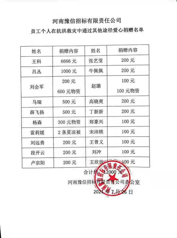 河南豫信招標有限責(zé)任公司愛心捐贈、助力抗洪