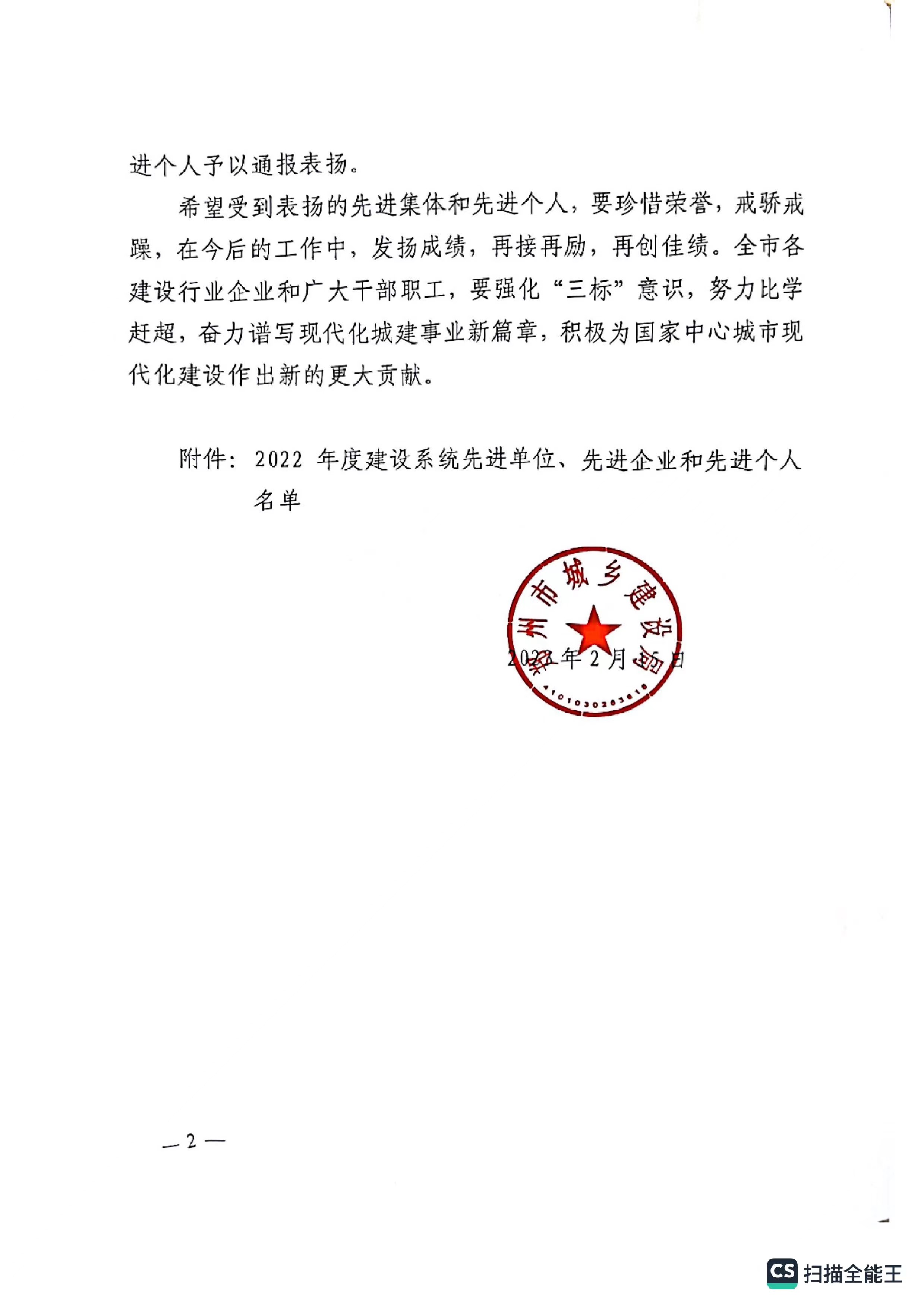 熱烈祝賀我公司獲得鄭州市城鄉(xiāng)建設(shè)局評定“2022年度建設(shè)系統(tǒng)先進(jìn)單位“企業(yè)稱號。