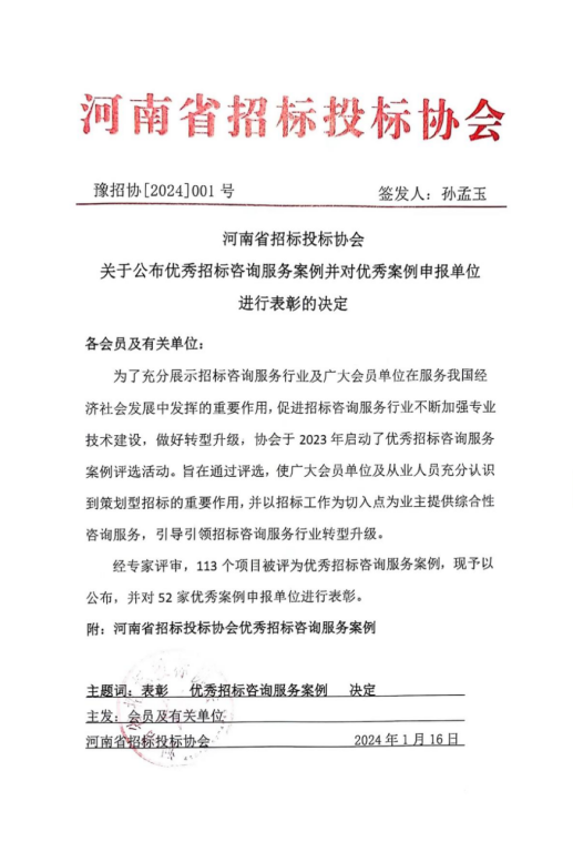 河南豫信招標(biāo)有限責(zé)任公司 五個(gè)項(xiàng)目被評為優(yōu)秀招標(biāo)咨詢服務(wù)案例