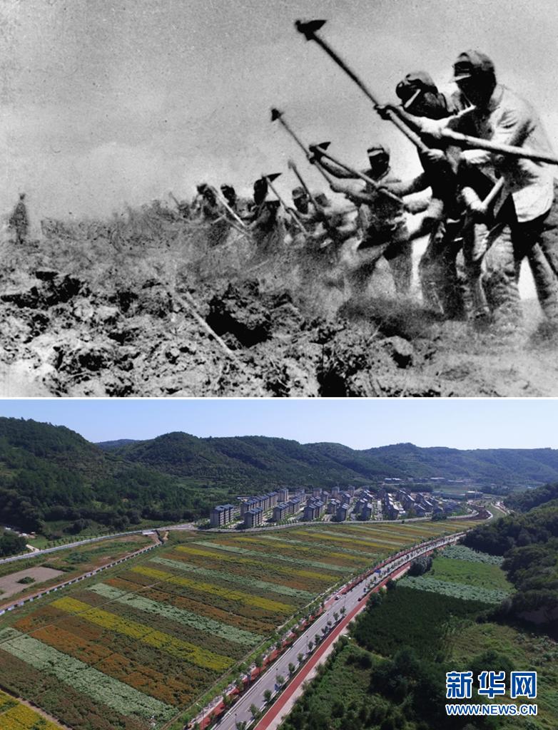 這是一張拼版照片,上圖為:抗日戰(zhàn)爭期間,八路軍三五九旅在南泥灣開荒生產(chǎn)(資料照片,新華社發(fā));下圖為:2020年8月25日拍攝的延安南泥灣景色(無人機(jī)照片,祁小軍攝)。新華社發(fā)