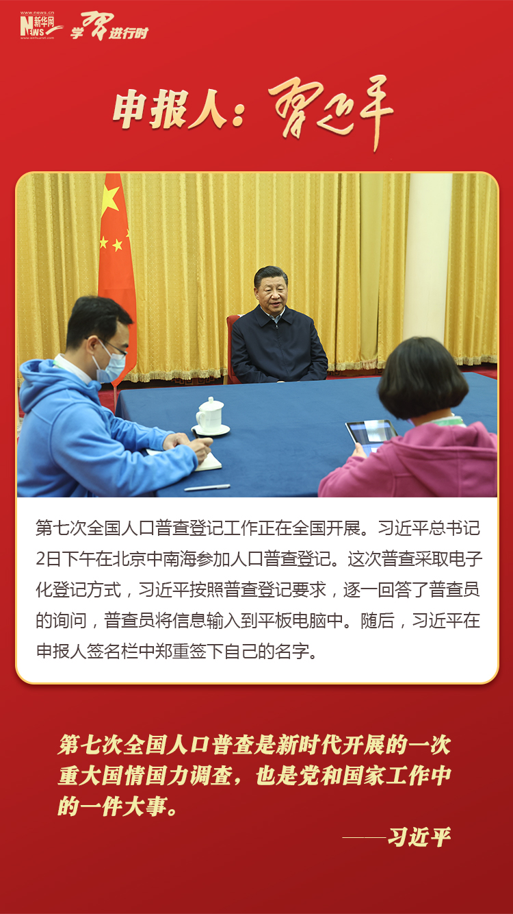習(xí)近平在北京中南海參加全國(guó)人口普查登記,帶頭申報(bào)。他按照普查登記要求,逐一回答了普查員的詢(xún)問(wèn),并在申報(bào)人簽名欄中鄭重簽下自己的名字。