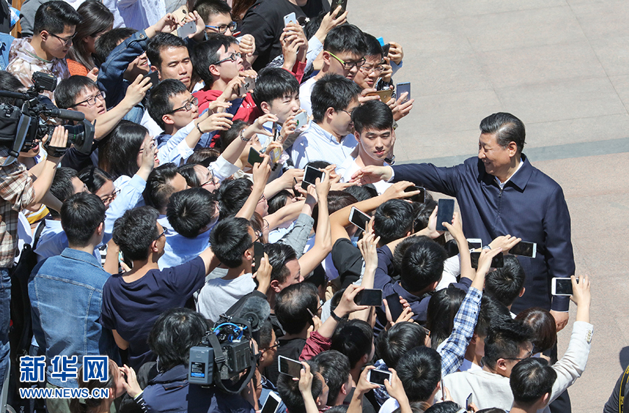2018年5月2日,中共中央總書記、國家主席、中央軍委主席習近平來到北京大學考察。這是習近平離開學校時同道路兩旁師生親切握手。新華社記者王曄攝