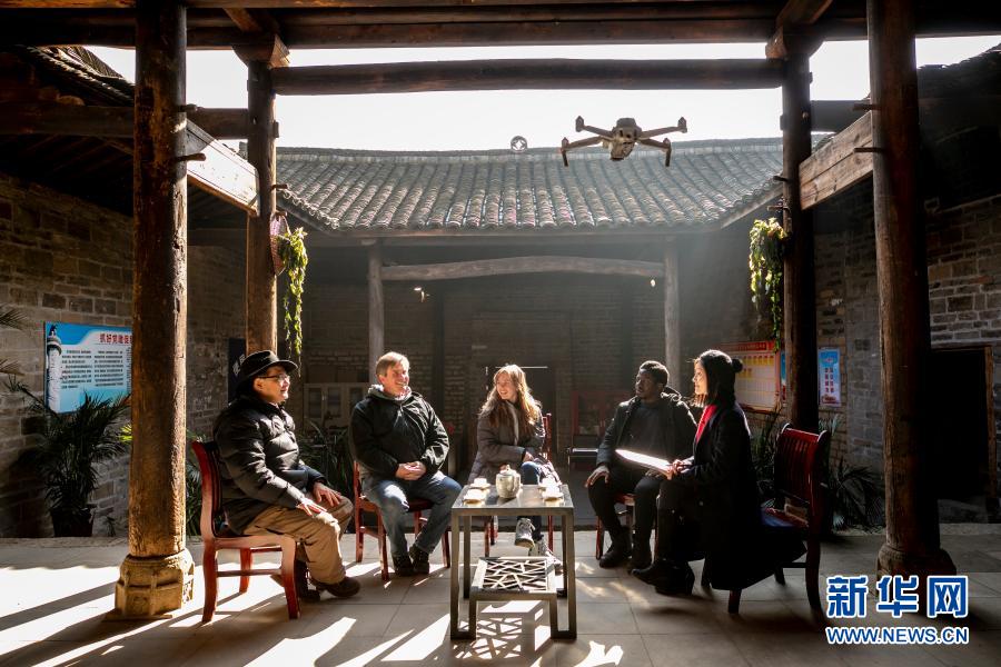 這是新華社記者繆曉娟(右一)在安徽省六安市金寨縣大灣村采訪四位受邀到這里參觀訪問的外國人。左起:植國明、肖恩、瑞貝卡·尼什、烏俊杰(2020年12月20日攝)。新華社記者郭沛然 攝