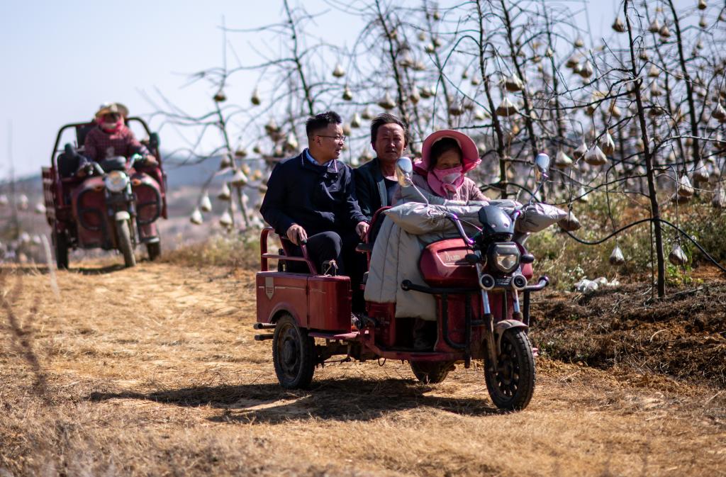 ??全國人大代表袁海波(右三)在云南省曲靖市馬龍區(qū)一種植基地了解務(wù)工人員就業(yè)需求(2023年2月11日攝)。新華社記者 江文耀 攝