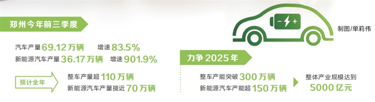 “今年前三季度,鄭州汽車產(chǎn)量69.12萬輛、增速83.5%,新能源汽車產(chǎn)量36.17萬輛、增速901.9%。預(yù)計(jì)全年整車產(chǎn)量超110萬輛,新能源汽車產(chǎn)量接近70萬輛?!编嵵菔姓嚓P(guān)負(fù)責(zé)人表示,鄭州正在加快建設(shè)全國重要的新能源及智能網(wǎng)聯(lián)汽車研發(fā)和生產(chǎn)基地,力爭(zhēng)2025年整車產(chǎn)能突破300萬輛、新能源汽車產(chǎn)能超150萬輛,整體產(chǎn)業(yè)規(guī)模達(dá)到5000億元。