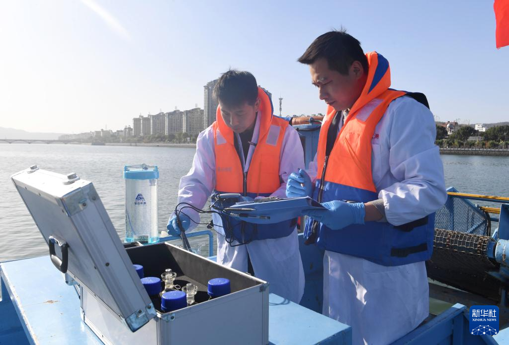 ??11月28日,在淅川縣鸛河流域城區(qū)段,南陽(yáng)市生態(tài)環(huán)境局淅川分局工作人員記錄采樣水質(zhì)情況。